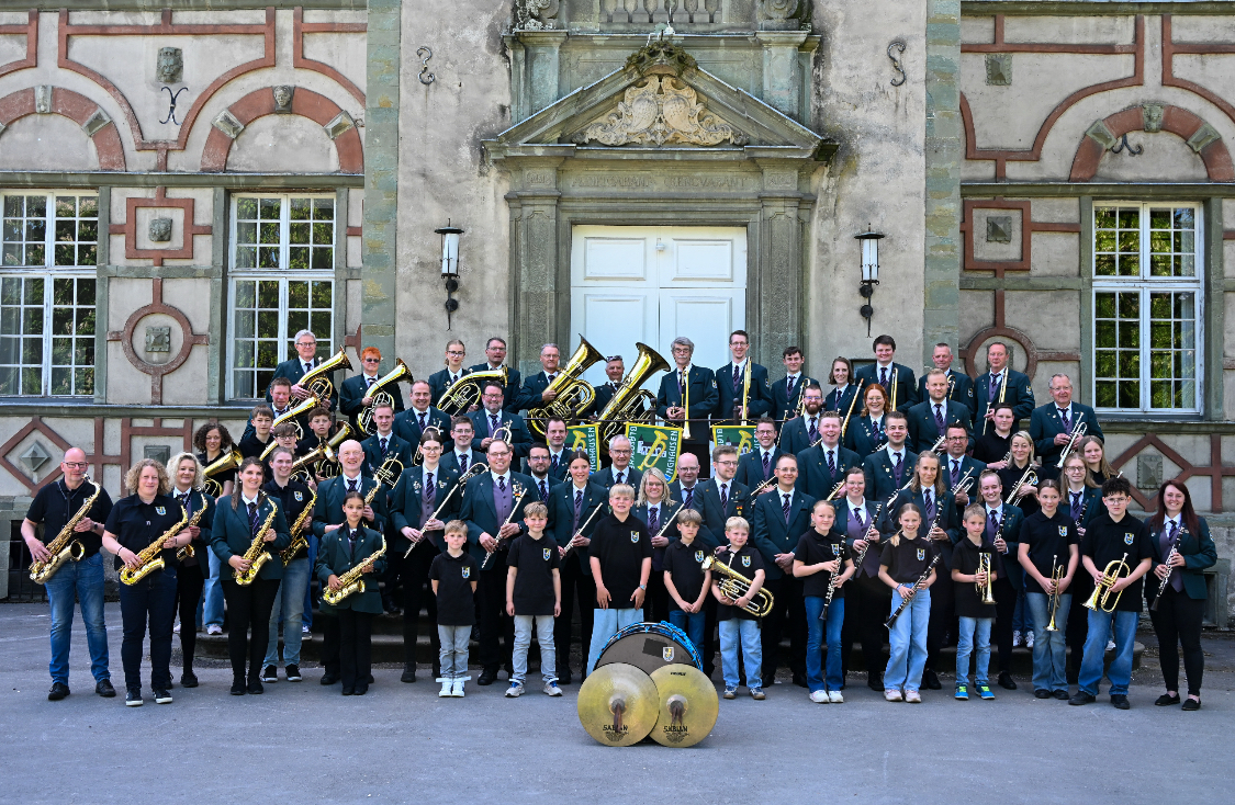 Das Blasorchester Hellinghausen vor dem Schloss Overhagen im Mai 2025