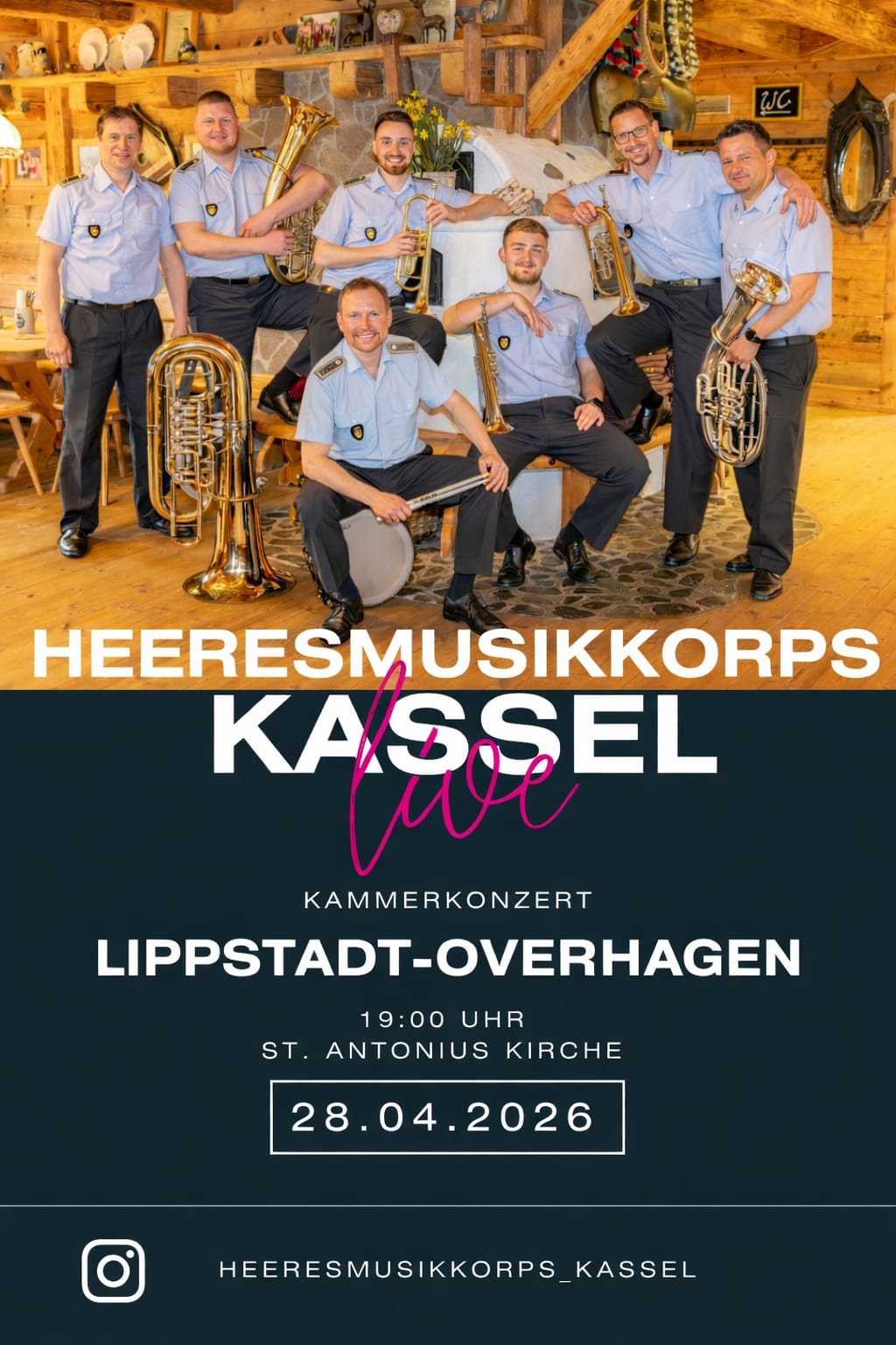 Anlässlich des 75-jährigen Jübiläums unseres Orchesters, spielt das Heeresmusikkorps Kassel ein Kammerkonzert in der St Antoniuskirche in Overhagen. Der Eintritt ist frei. Das Nachwuchsorchester freut sich über Spenden. Eine "Spendentuba"steht dafür bereit.